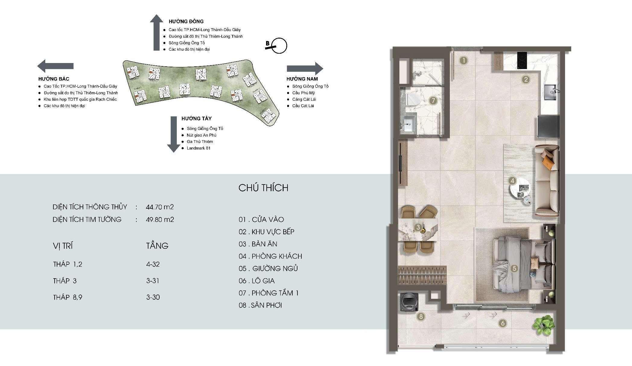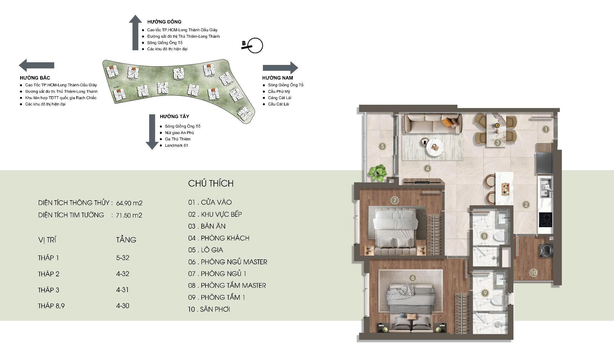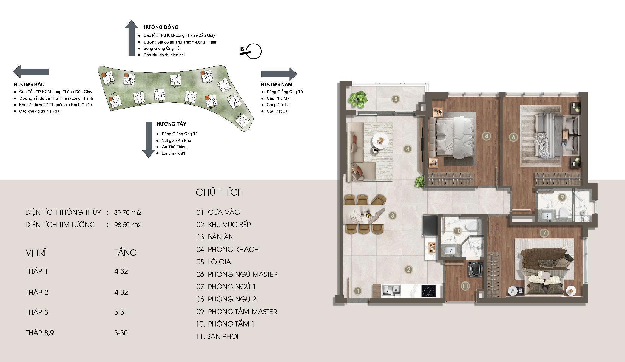 Là một trong những khu căn hộ compound hiếm hoi sở hữu vị trí độc tôn với ba mặt giáp sông thoáng đãng, nơi bạn có thể phóng tầm mắt không giới hạn: trước mặt là hồ cảnh quan Lake View và trung tâm đô thị mới The Global City sôi động, bên kia là Thảo Điền thanh lịch và biểu tượng Landmark 81 sừng sững, còn xa xa là nhịp sống hiện đại của Thủ Thiêm và trung tâm Quận 1 – tất cả hòa quyện trong một không gian không bị che chắn, ngập tràn ánh sáng và hơi thở thiên nhiên, mang đến trải nghiệm sống đẳng cấp mỗi ngày.