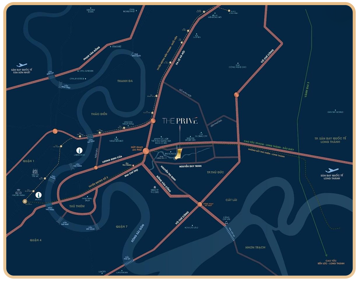 The Privé, vị trí đắc địa ngay mặt tiền đường song hành cao tốc TP HCM – Long Thành, cách nút giao An Phú chỉ 1km, dự án thuận tiện kết nối đến tất cả các khu vực của TP HCM mở rộng và sân bay Long Thành.